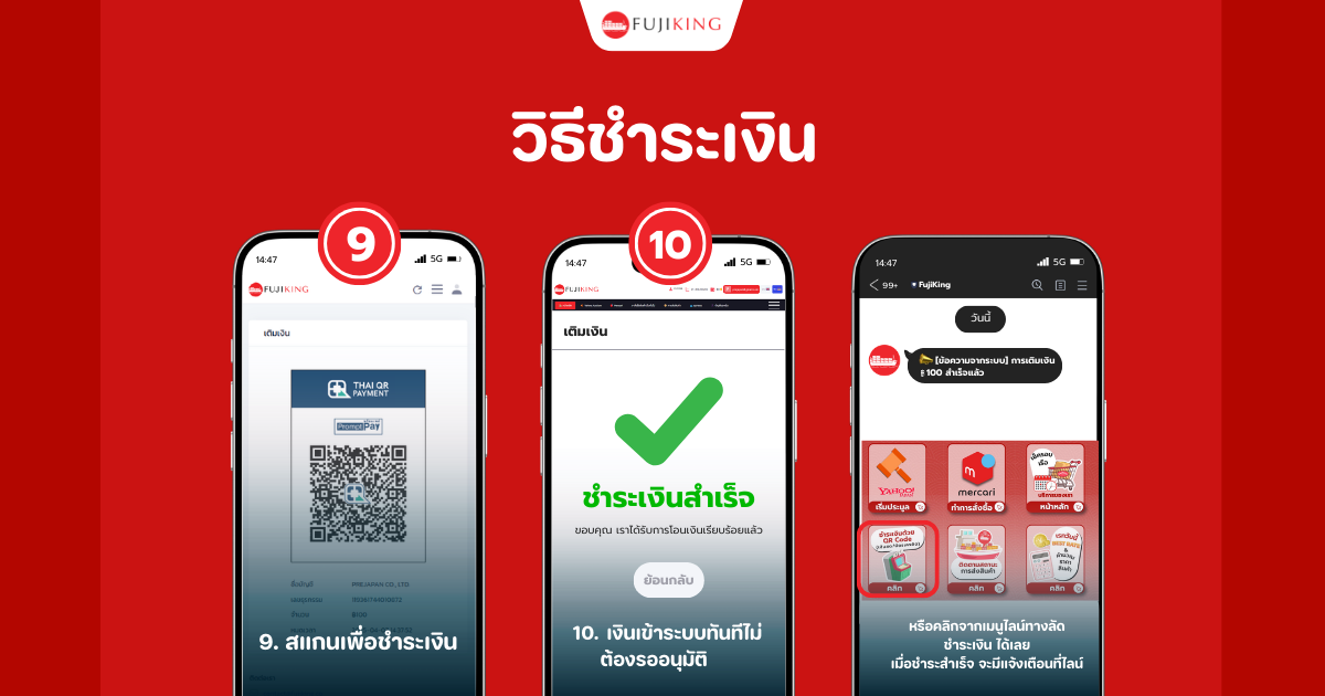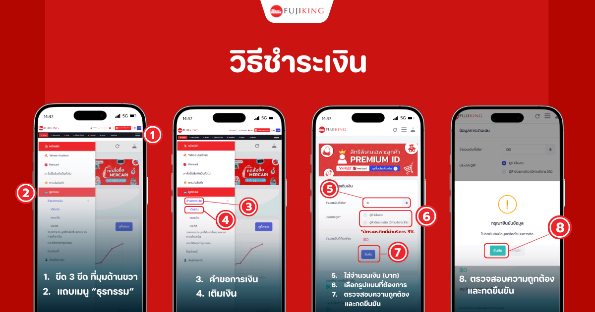 ใน FujiKing คุณสามารถเติมเงินเข้าระบบไว้ก่อน เพื่อเตรียมสั่งซื้อหรือประมูลได้เลย หรือถ้ามียอดค้างชำระก็สามารถกดจ่ายผ่านระบบได้ทันที ส่วนใครที่มียอดเงินคงเหลือ ก็สามารถกดถอนเงินกลับได้ง่ายๆ ไม่ต้อง