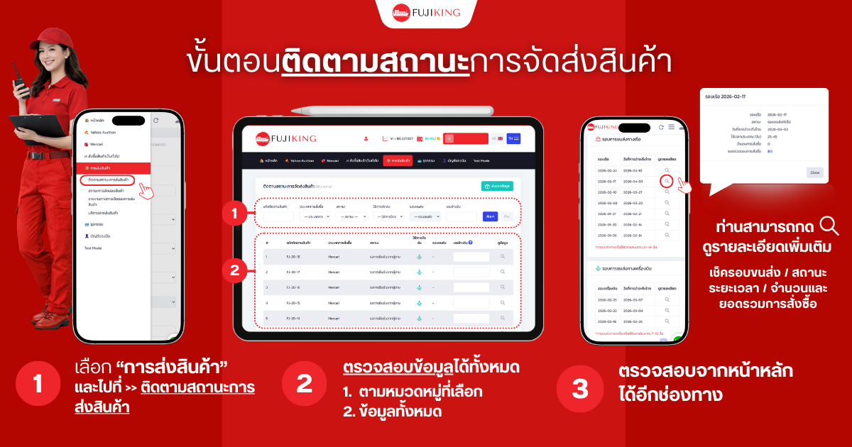 ใน FujiKing สามารถเช็กสถานะสินค้าได้เองตลอดเวลา ตั้งแต่ขั้นตอนร้านค้าจัดส่งเข้าโกดัง ไปจนถึงส่งออกจากญี่ปุ่นและกำลังเดินทางมาไทย