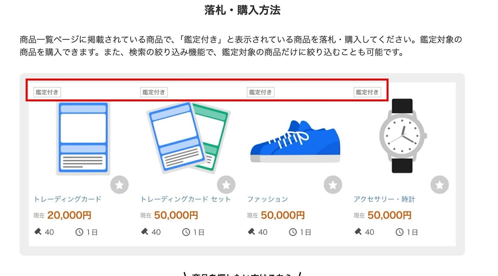 นอกจากนี้ ในสินค้าบางรายการที่มีมูลค่าสูงบน Yahoo Auctions Japan จะมีระบบ “鑑定付き (Authentication Service)” ซึ่งเป็นบริการตรวจสอบของแท้โดยผู้เชี่ยวชาญก่อนส่งถึงผู้ซื้อ
